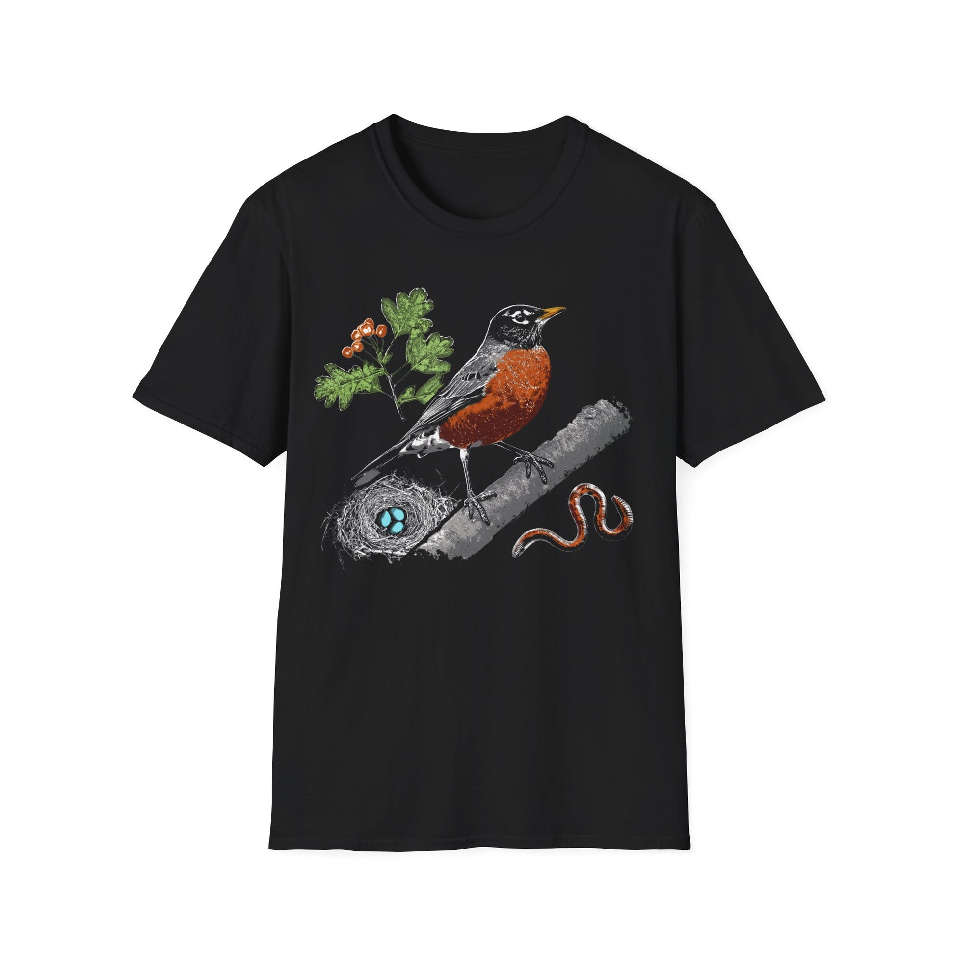 The American Robin (Turdus migratorius) is one of North America's most familiar birds. This member of the thrush family is a charming, beloved backyard bird across the continent. This shirt shows off a male robin with some aspects of robin ecology.