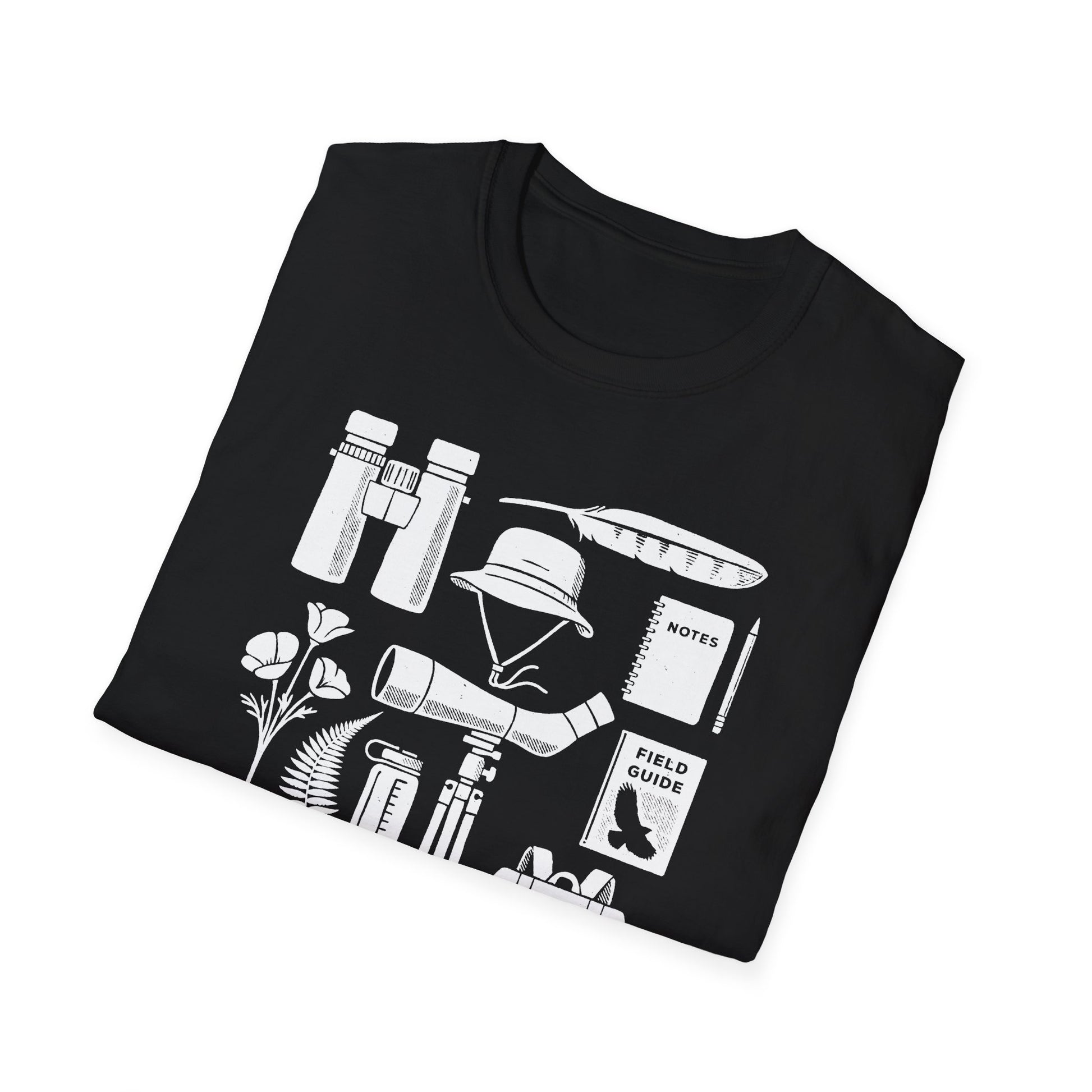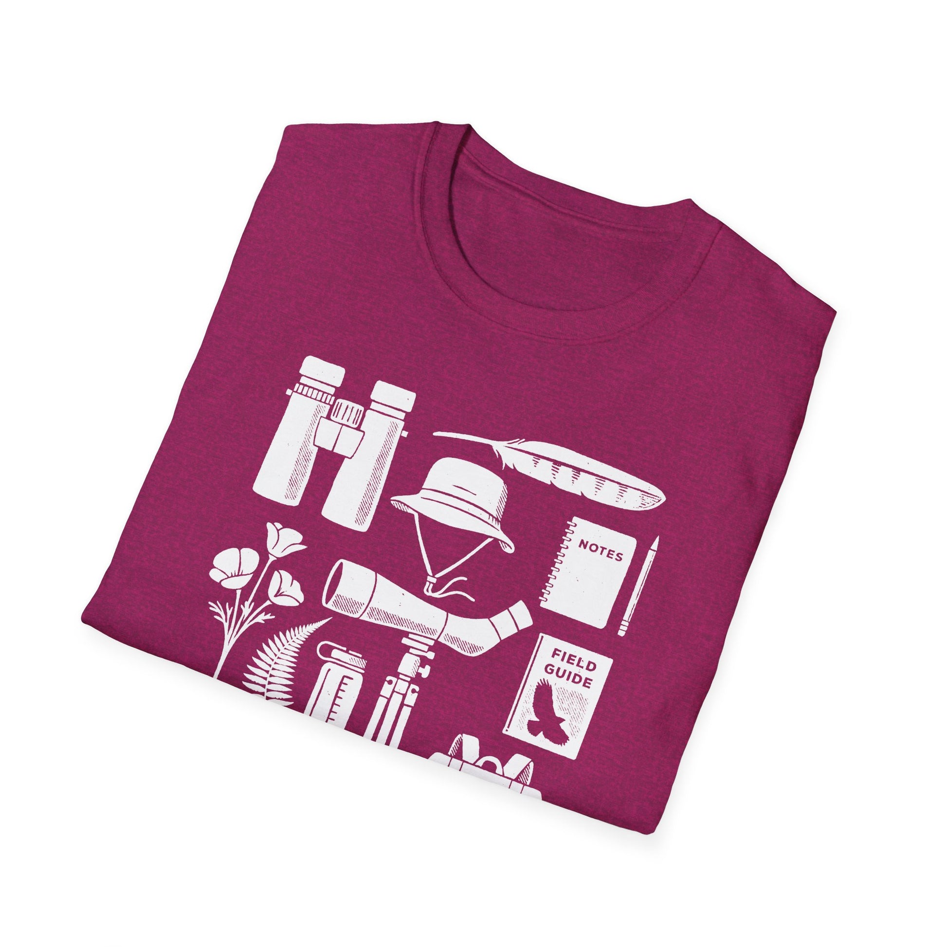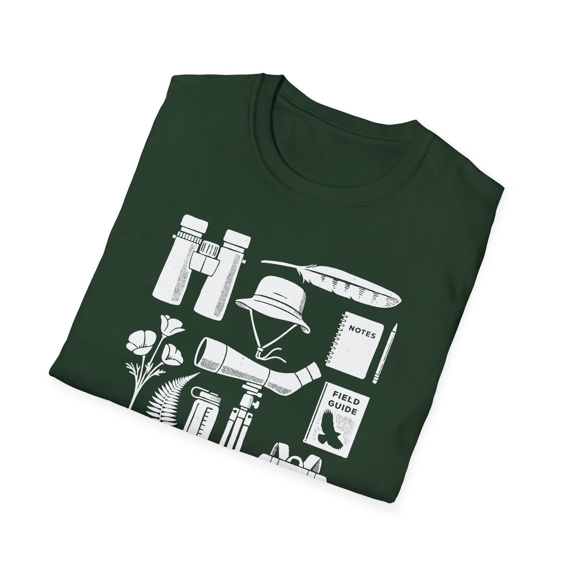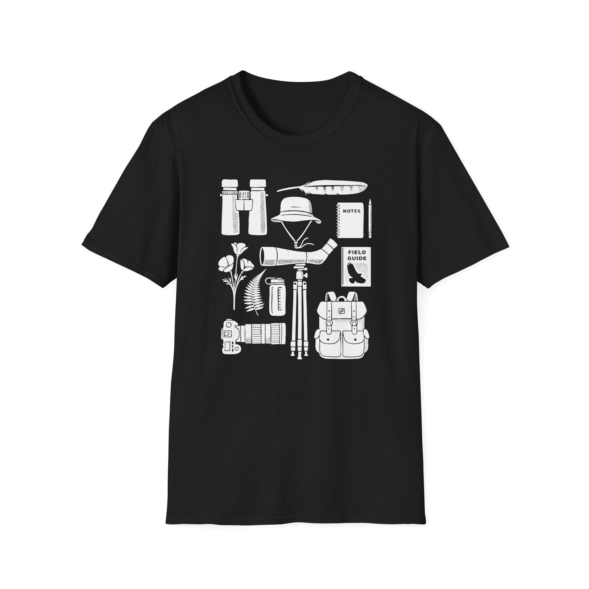 The essentials of an avian adventure—this shirt lays out all the classic birding gear. All you need for a joyful day in the field.