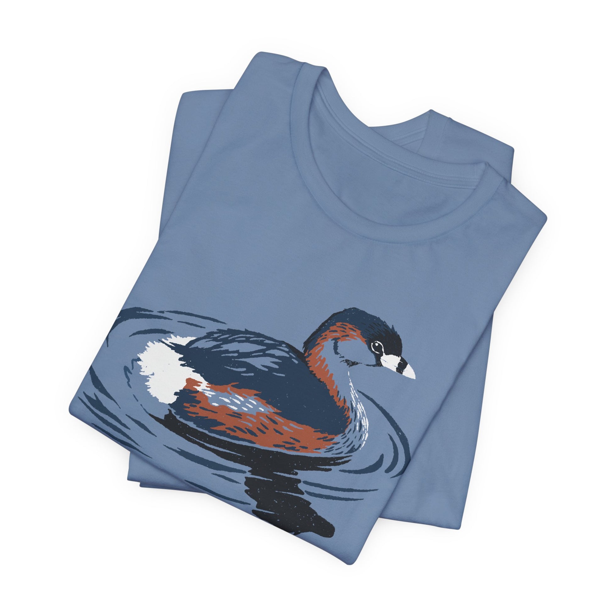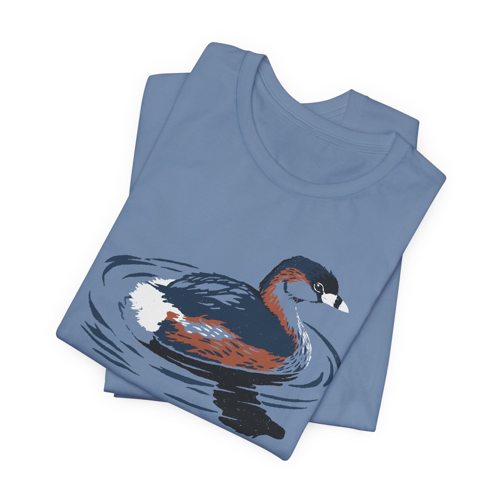 The small but pugnacious Pied-billed Grebe (Podilymbus podiceps) is a secretive, yet familiar bird in freshwater habitats across the Americas. Display your love of grebes with this stylish shirt.